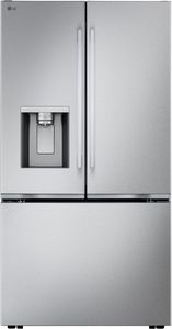 LG 36 in. 23.7 Cu. Ft. PrintProof™ Stainless Steel Counter Depth MAX™ with Zero Clearance™ 3-Door French Door Refrigerator with Thin Door Design featuring slim in door ice and water dispenser and new hybrid handles.Read More