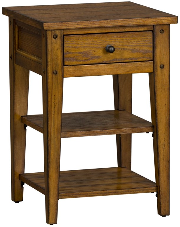 Accent your space with the casual country style Lake House chair side table. This piece features an oak finish, appealing planked top, two open planked shelves, simplistic wood and peg accents, one drawer accented by antiqued brass knob hardware, anchored by a tapered leg design.Read More