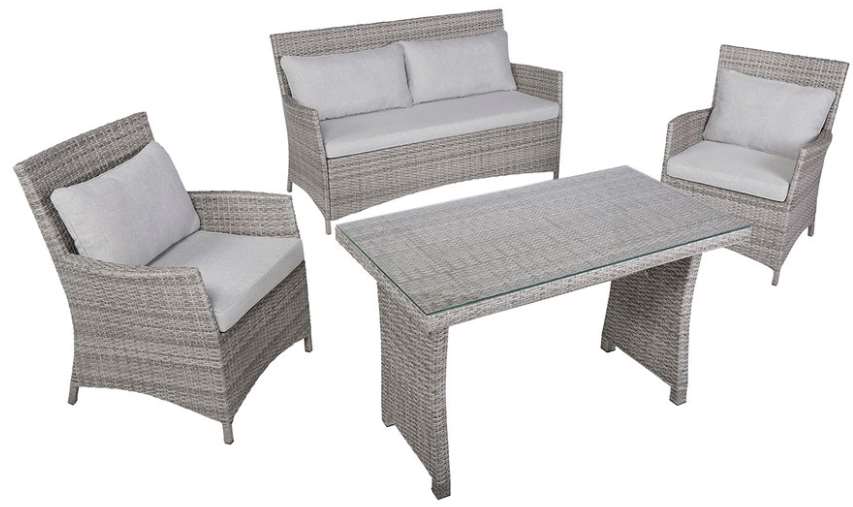 This set comes complete with a loveseat, 2 chairs and a table. Use the generous size table to hold your favorite summer time snacks, beverage, board game or all three! Frame is constructed of powder coated aluminum, the table boasts a tempered glass top and the cushions are made of polyester to provide years of enjoyment.Read More